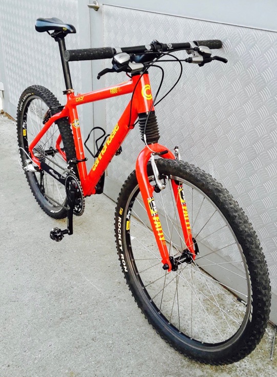 F800 SL CAAD2 frame in Viper Red. Year 1998, no disc mounts yet and the Headshok Fatty with coil / elastomer and full on/off locking on-the-fly.